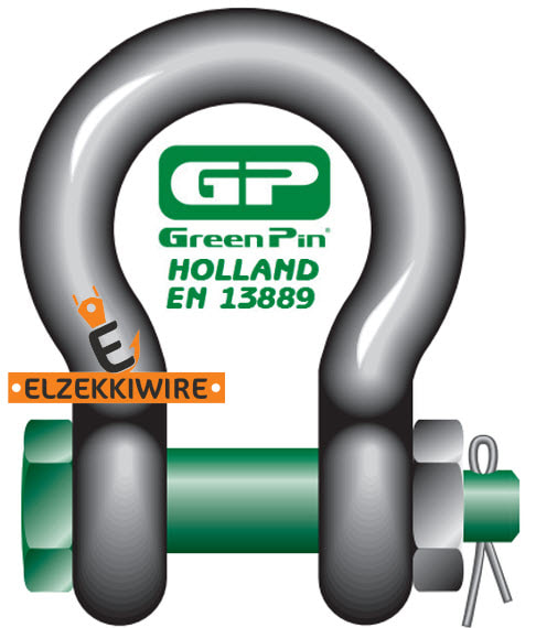 Green Pin Bow Shackles With Safety Bolt G-4163 • Material : Bow And Pin High Tensile Steel, Grade 6, Quenched And Tempered. • Safety Factor : MBL equals 6 x WLL • Standard : EN 13889 And Meets Performance Requirements Of US Fed. Spec. RR-C-271 Type IVA Class 2, Grade A • Finish : Hot Dipped Galvanized • Temperature Range : -20°C Up To +200°C